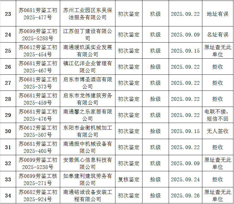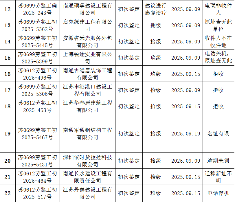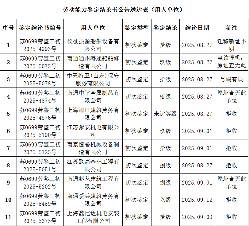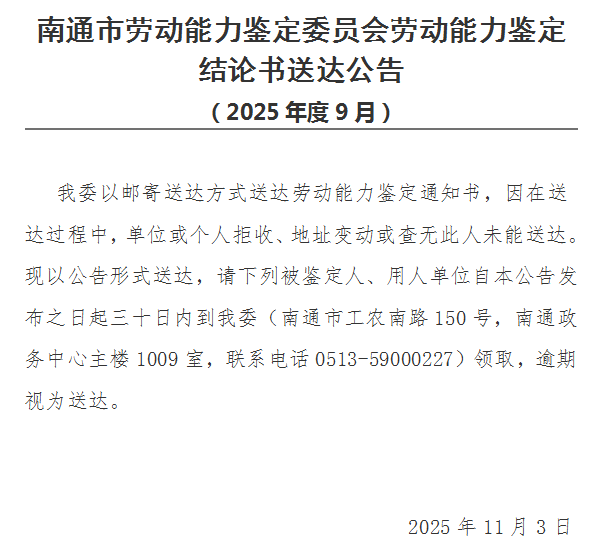 南通市劳动能力鉴定委员会劳动能力鉴定结论书送达公告(2025年度9月)